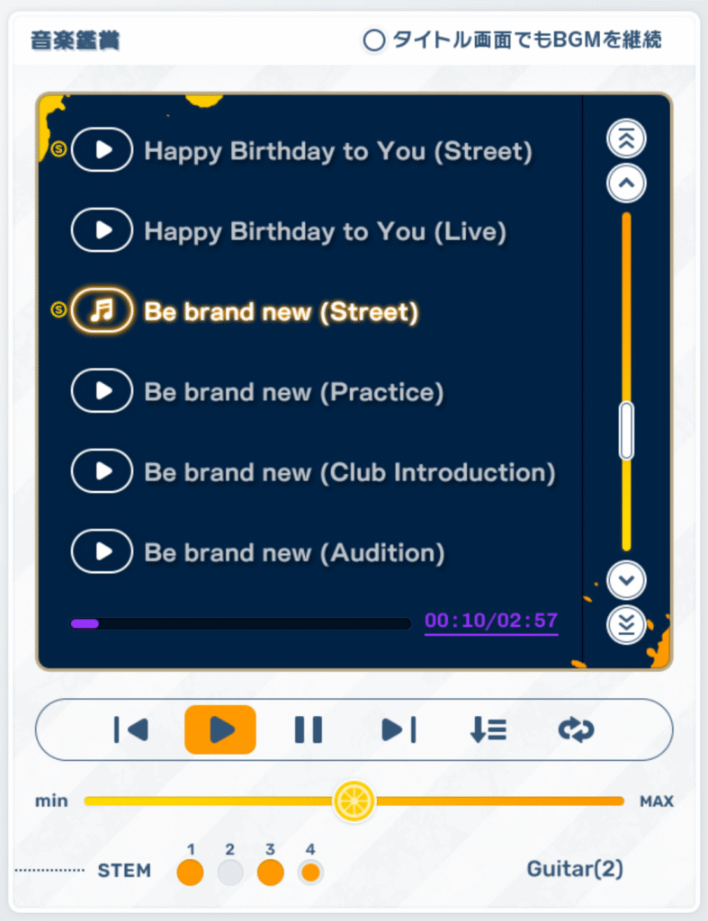 イメージが湧かない人はゲームを立ち上げてサウンドテストを起動してみよう!路上ライブの曲は「Be brand new (Street)」だ。