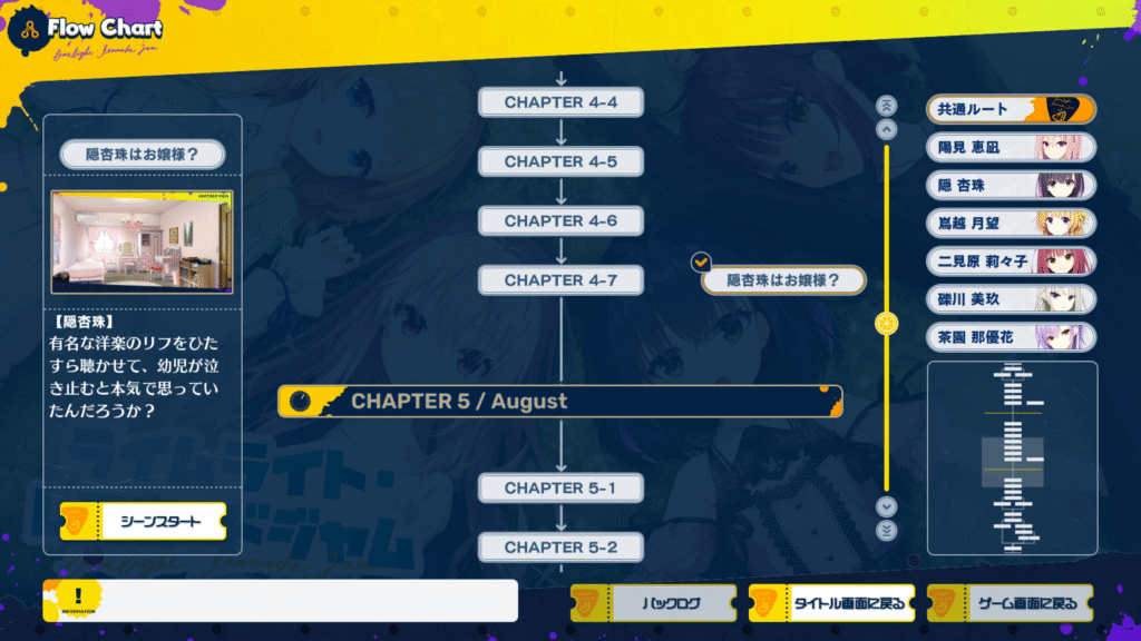 これらはフローチャートからクリックしないと閲覧できないという、過去のゆずソフト作品には無かった新システムとなっている。プログラマーを必要とするシステムレベルの改変をしてでも、仲間集めフォーマットの力を強化しようとする明確な意志があるのだ(アフターストーリーと同じ仕組みだろ!と言われたらそれまでですが)。